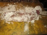 - Salt and pepper and roll in the flour until covered. Shake excess flour