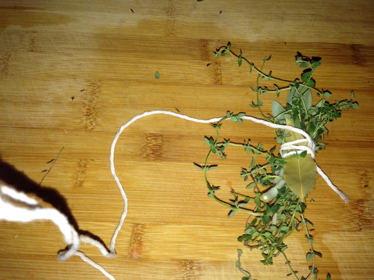 - Meanwhile prepare your bouquet garni by tying all the herbs together and leaving about 1 ft. of sting to tie to the handle of your pan- this will make it easier to fish out later.