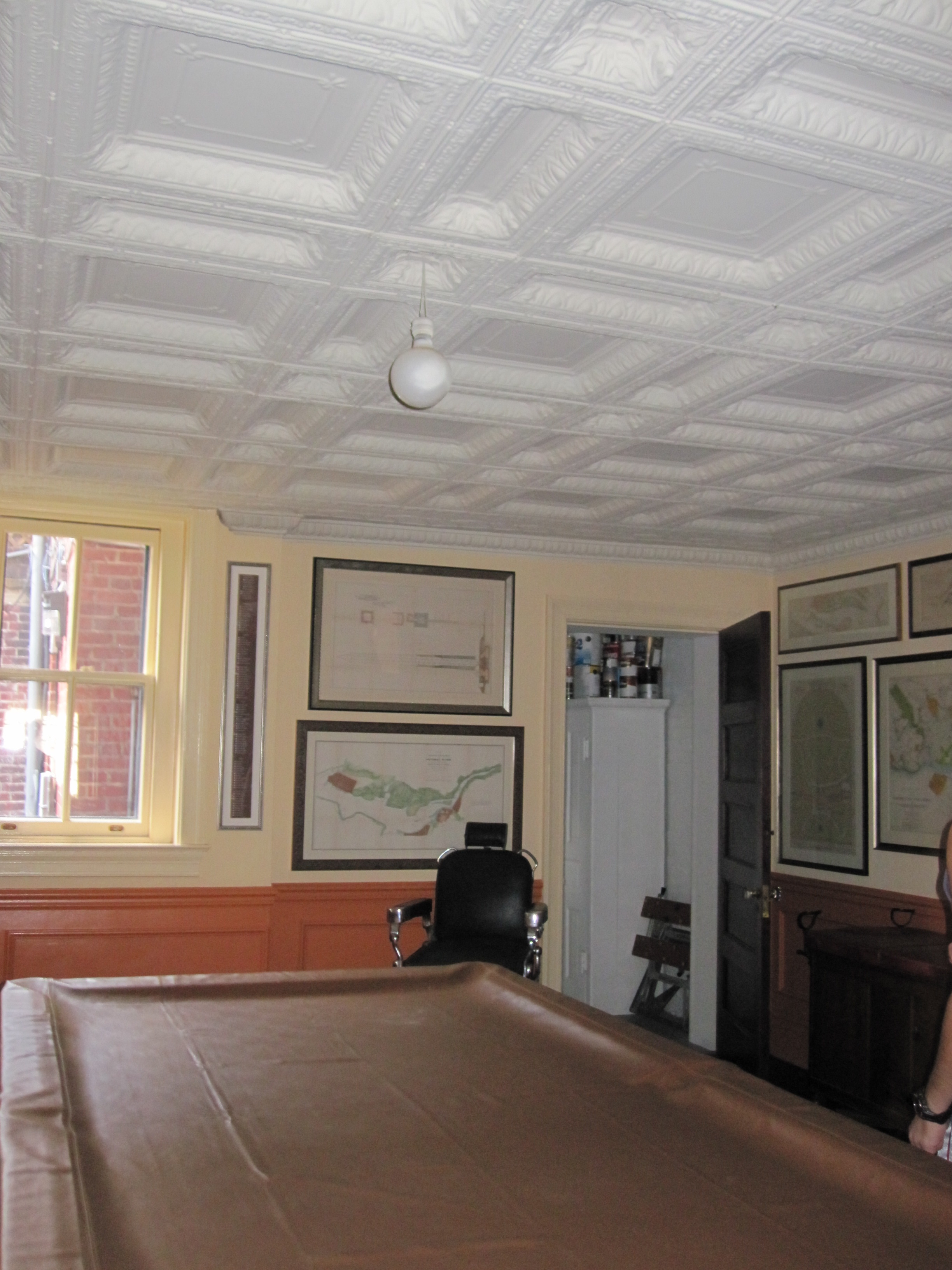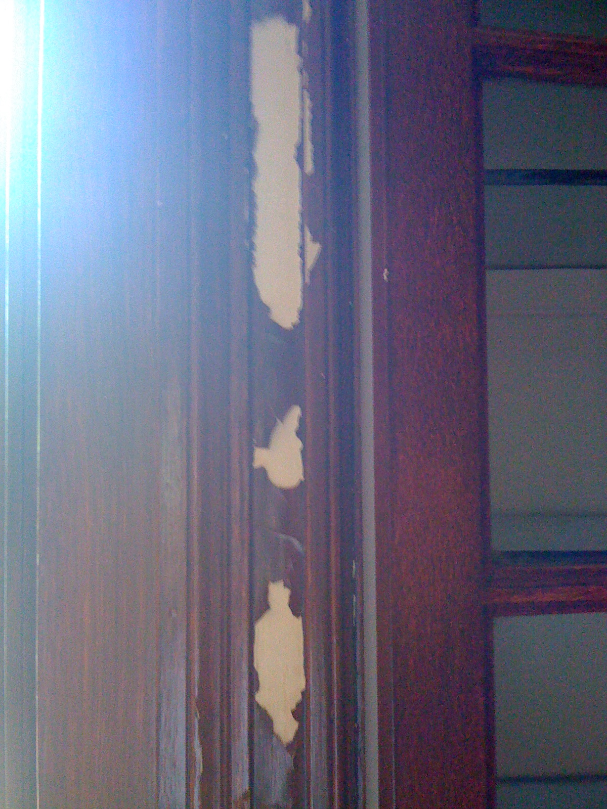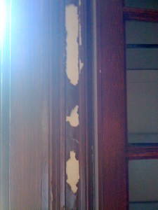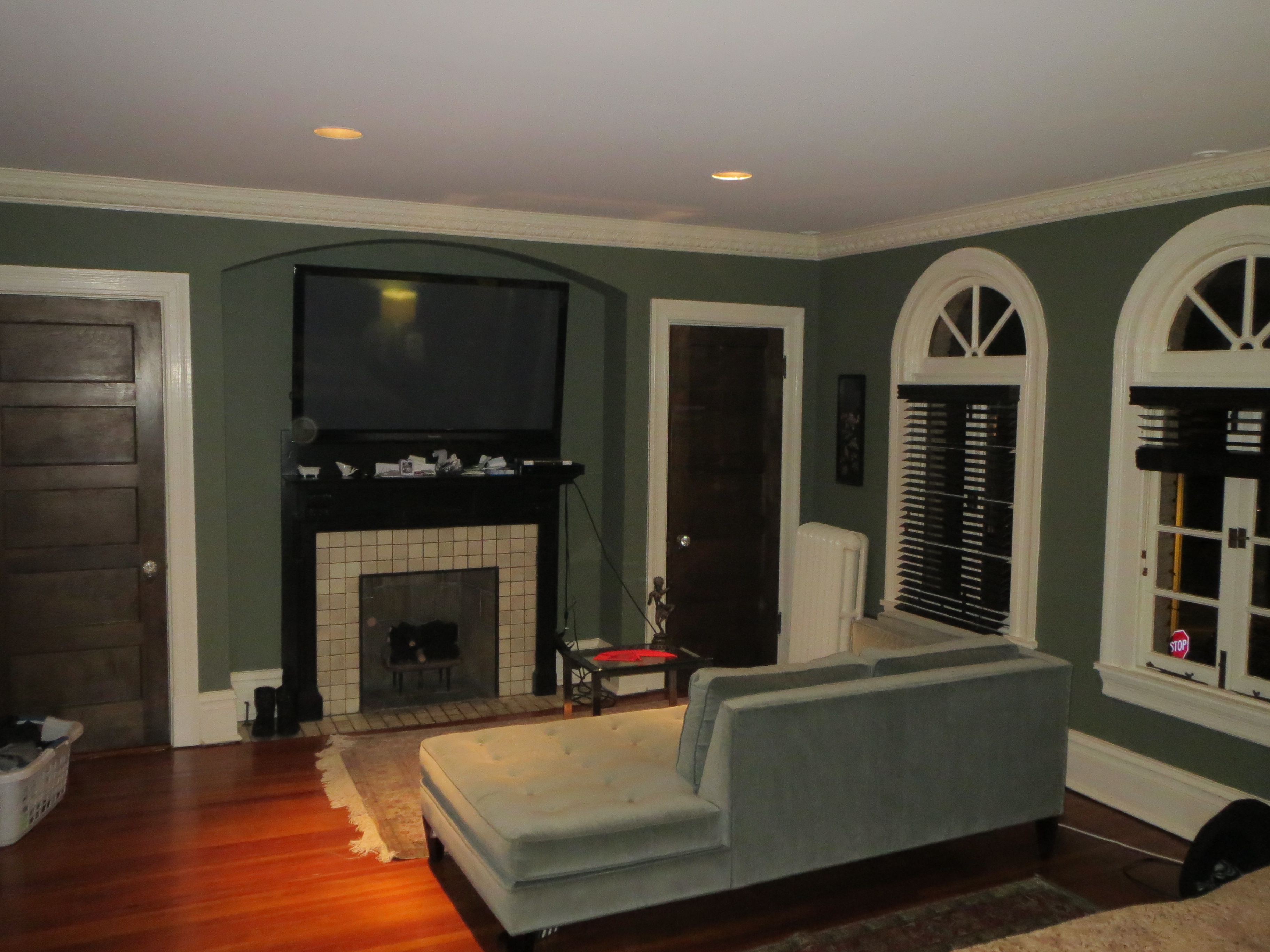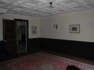 We originally thought that the dining room was wood paneling. It actually was wood panelling, but some cheap wood- pine? painted over to look like more expensive wood. I guess the wood paneling in the living room- which is truly fantastic- should be enough. When we finally got the previous owner outside the house and realized that the paint was peeling… Teague suggested the white to liven up the room and he was right. My furniture, again, doesn’t fit the room.
